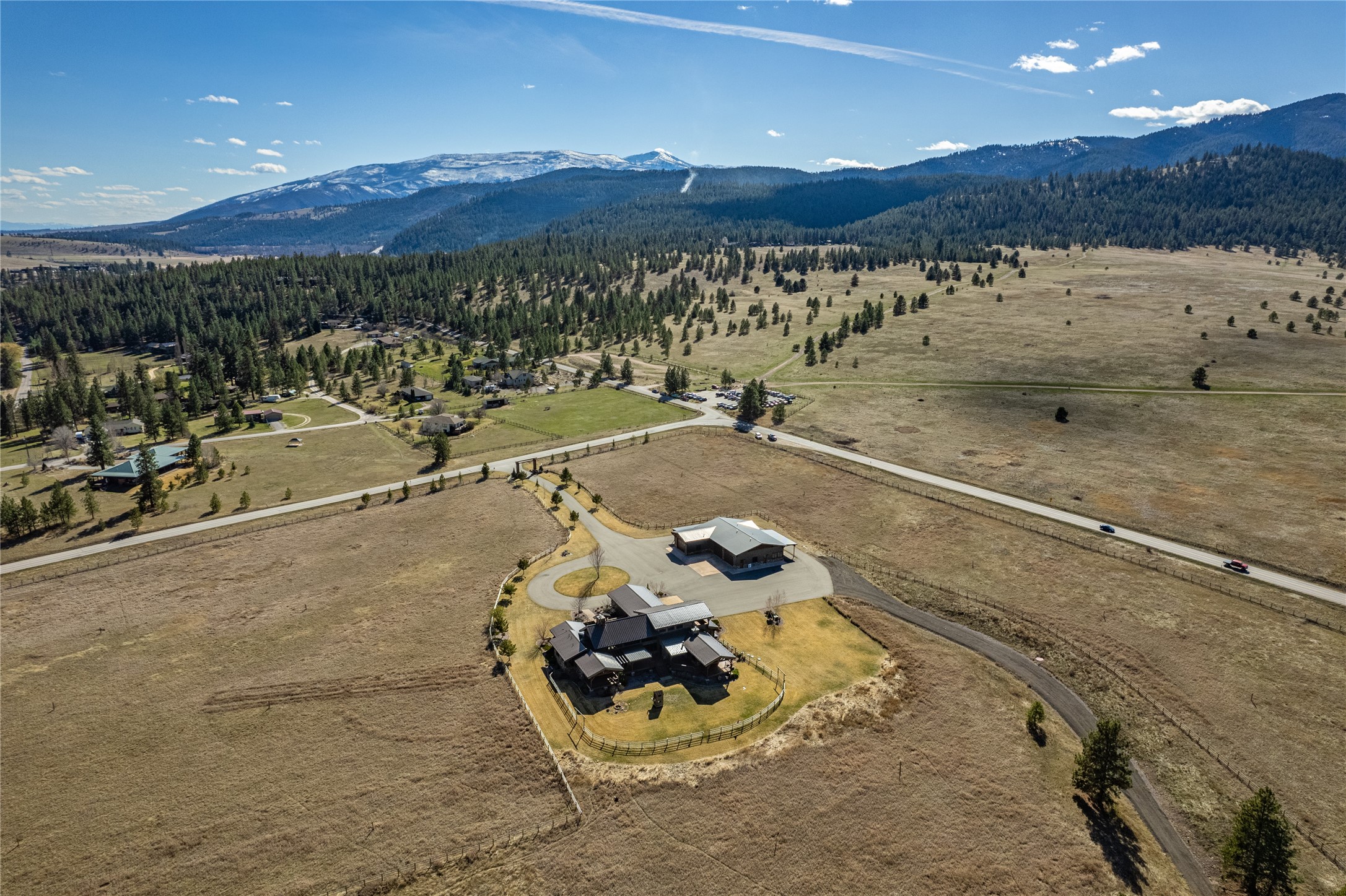 On 27.79 acres just outside Hamilton, this newly built executive home blends luxury with rustic charm and panoramic mountain views. Offered fully turnkey, it features a grand lodge-style design, guest house, horse facilities, and extensive amenities—providing privacy, elegance, and convenience in the heart of Montana’s Bitterroot Valley.